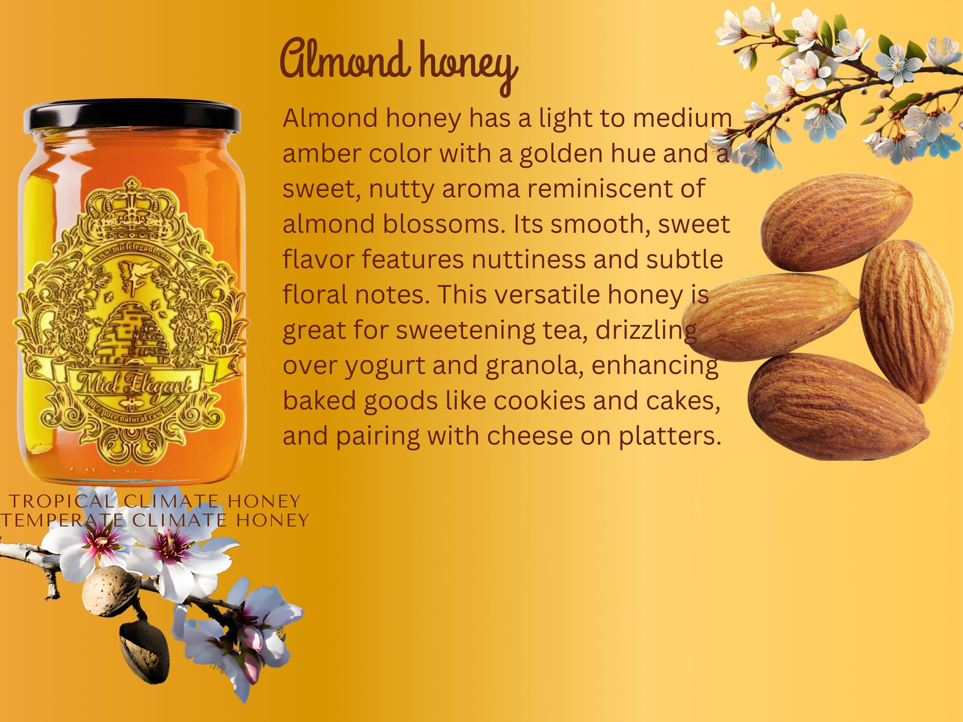 Almond honey typically exhibits a light to medium amber color, often accented by a golden hue. Its aroma is sweet and nutty, evoking the scent of almond blossoms, which creates an inviting and pleasant fragrance. The flavor profile of almond honey is smooth and sweet, featuring a distinct nuttiness complemented by subtle floral notes.