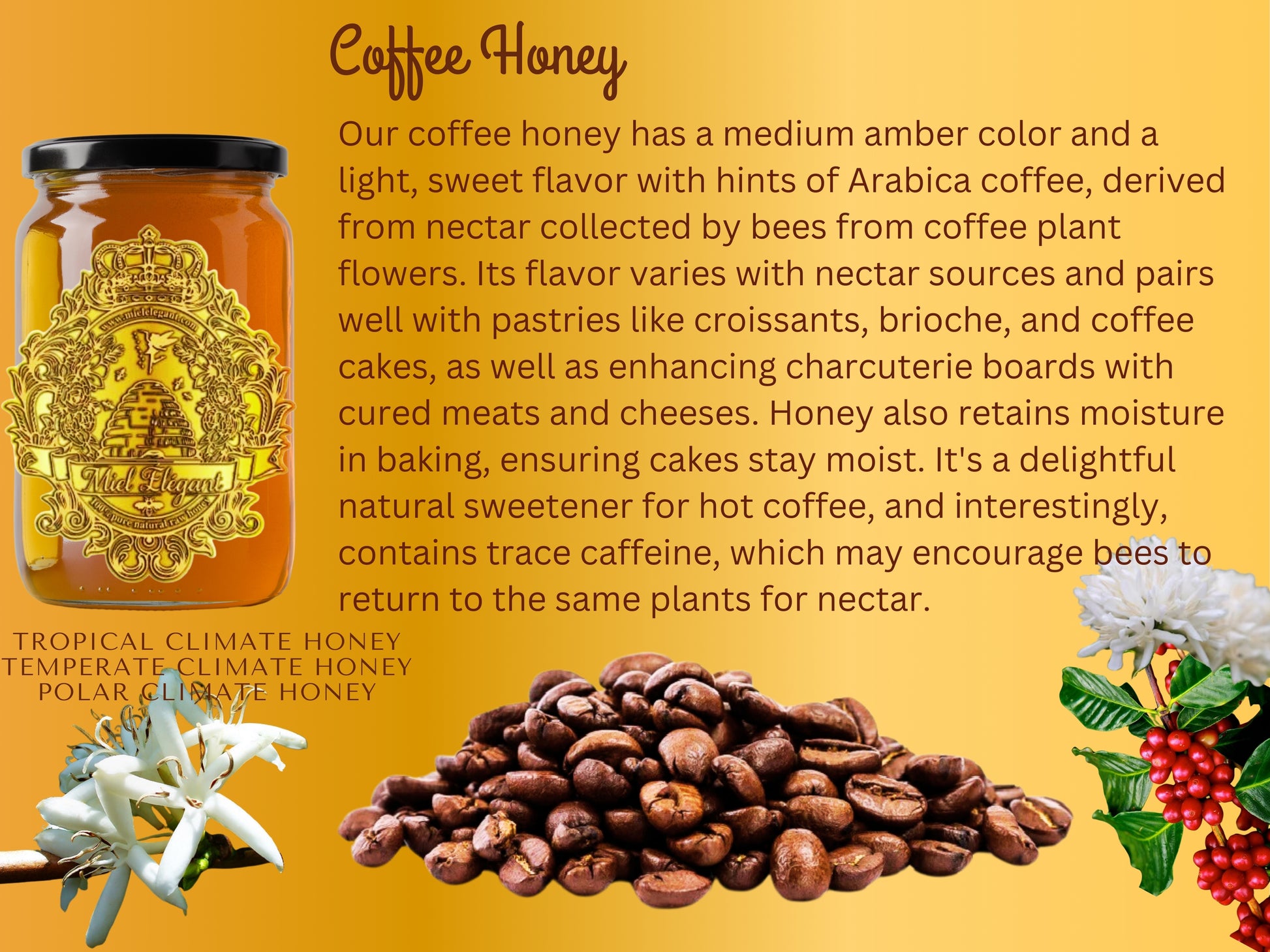Our coffee honey boasts a medium amber hue and presents a light, sweet flavor complemented by subtle notes of Arabica coffee. This unique honey is produced from the nectar that bees collect from the flowers of coffee plants. The flavor and color of honey can vary significantly depending on the nectar source This delightful honey pairs wonderfully with pastries, making it an excellent accompaniment to croissants, brioche, and coffee cakes. It can also enhance a charcuterie board when served alongside cured meats and a selection of hard and soft cheeses. Additionally, incorporating it into your favorite baking recipes can contribute to moisture retention, as honey is hygroscopic, meaning it readily absorbs moisture, ensuring cakes remain extra moist. For a natural sweetener, consider adding it to your hot coffee for a delightful experience.Interestingly, both the nectar and honey derived from coffee blossoms contain trace amounts of caffeine. Research suggests that this caffeine may encourage bees to return repeatedly to the same plants until all the nectar is harvested.