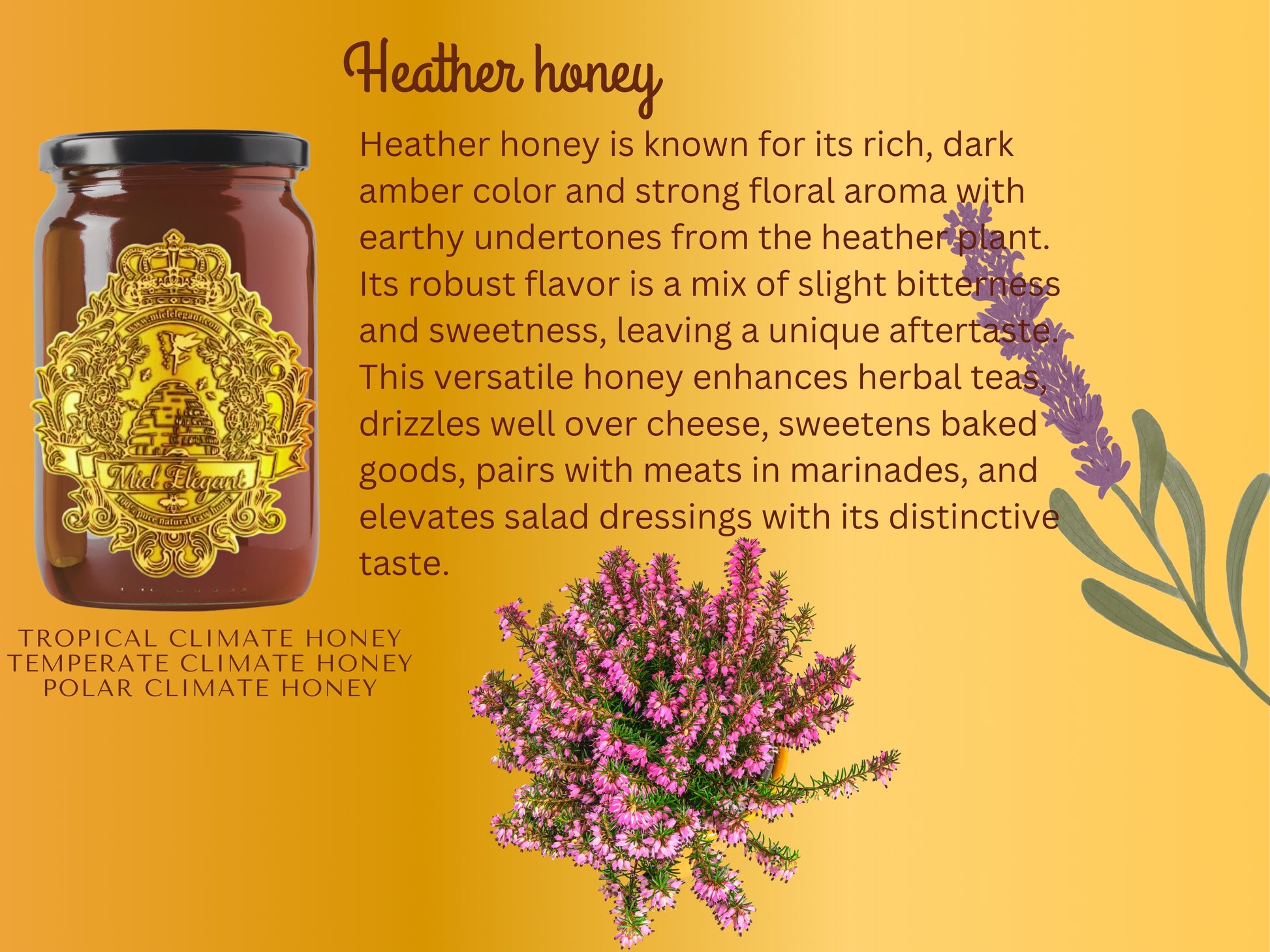 Heather honey is distinguished by its rich, dark amber hue, often appearing nearly black. It possesses a strong floral aroma that is unmistakable, complemented by earthy undertones thatreflect its origin from the heather plant. The flavor profile of heather honey is robust and complex,characterized by a slight bitterness balanced by sweetness, and it leaves a unique, lingeringaftertaste that differentiates it from other honey varieties.This versatile honey can be utilized in numerous ways. It enhances herbal teas, harmonizingbeautifully with their flavors. Additionally, it makes an excellent drizzle over cheese or serves as a sweetener in baking, enriching recipes with its depth. Heather honey also pairs exquisitely withmeats, particularly in marinades or glazes, imparting a rich flavor.Furthermore, incorporating it into dressings can elevate salads with its distinctive taste.